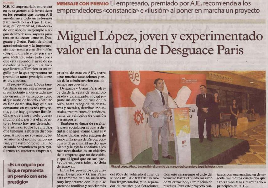 Miguel López Abad, gerente de Desguace y Gruas Paris, ha sido reconocido con el Premio al Empresario Joven del año por AJE (Asociación de Jovenes Empresarios). Este prestigioso galardón es