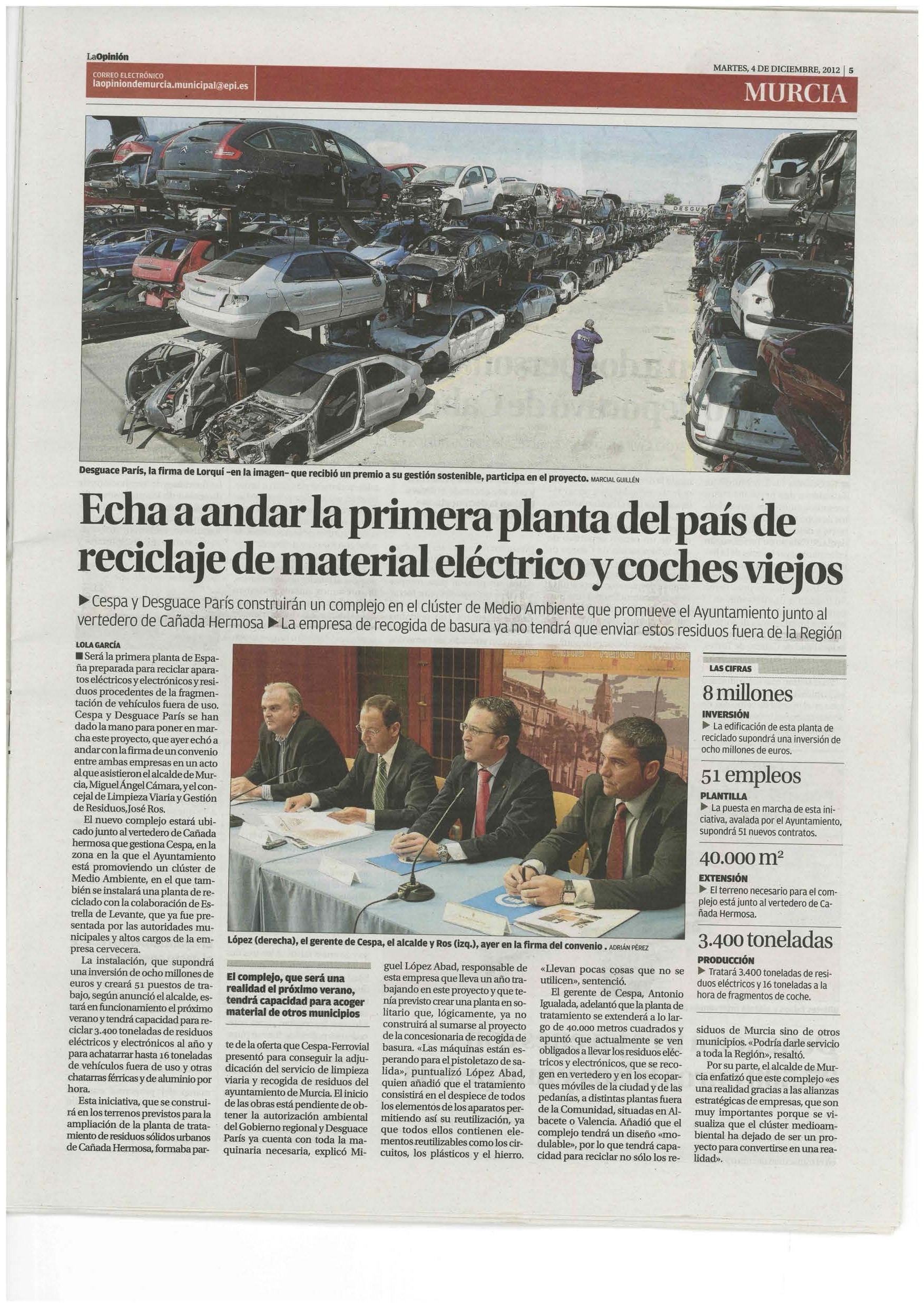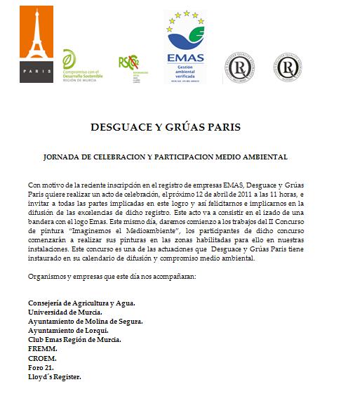 Con motivo de la reciente inscripción en el registro de empresas EMAS, Desguace y Grúas Paris quiere realizar un acto de celebración, el próximo 12 de abril de 2011